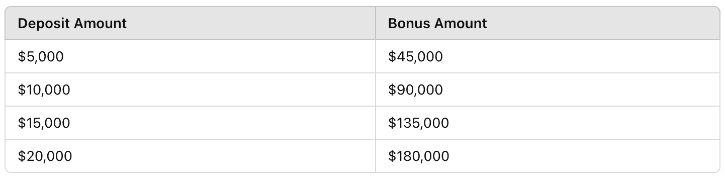 - The bonus comes with a trading volume requirement to withdraw profits. For example, a $90,000 bonus requires trading a total of 180,000 standard lots.