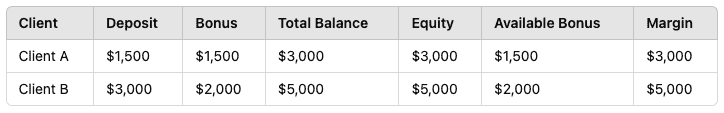 • Example: If Client C has a balance of $2,500 and a bonus of $2,000, and requests a $1,000 withdrawal, the new balance will be $1,500 and the bonus will be $1,000.