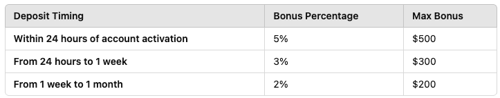 - The bonus is based on your initial deposit, and the bonus percentage depends on when you make your deposit after activation.