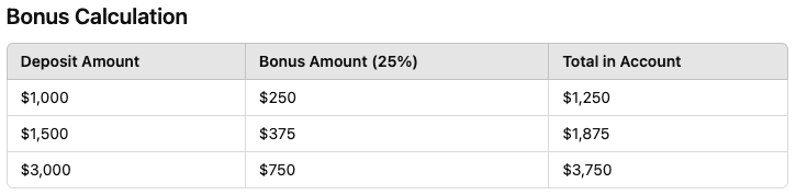 FXGT offers a 25% bonus up to $10,000 when you transfer funds from your eWallet or make direct deposits into your Mini or Standard+ accounts. This bonus is NOT AVAILABLE to residents of the USA, EU member states, Canada, or North Korea.