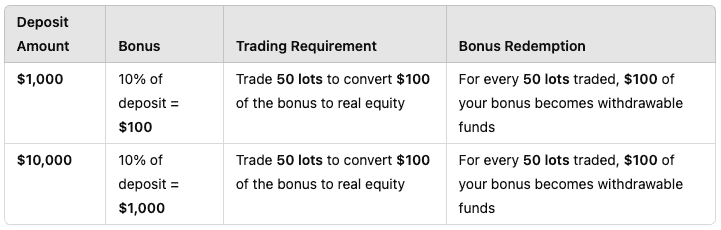- Bonuses are converted into real equity as you trade. Every 50 lots traded converts $100 of the bonus into withdrawable funds.