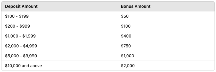 - Fund your account with a minimum of $100. The bonus amount you receive will depend on your deposit size, as outlined in the table below.