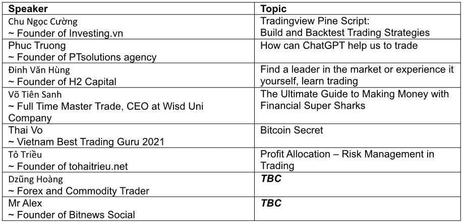 Furthermore, we have new speakers such as Võ Tiên Sanh (Full Time Master Trader & CEO at Wisd Uni Company), Tô Triều (Founder of tohaitrieu.net), Phuc Truong (Founder of PTsolutions agency) and Hoàng Soros (Investor- Trainer).