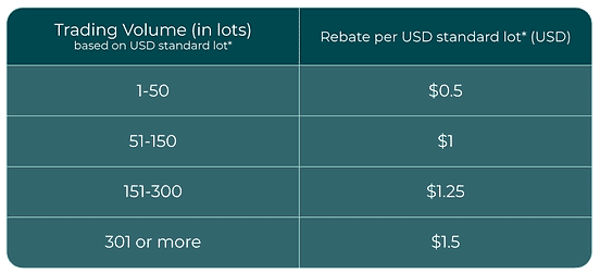 For example, a trader who completes a total volume of 170 lots in a month will earn a rebate of $1.25 for each lot, resulting in a total rebate of $212.50.
