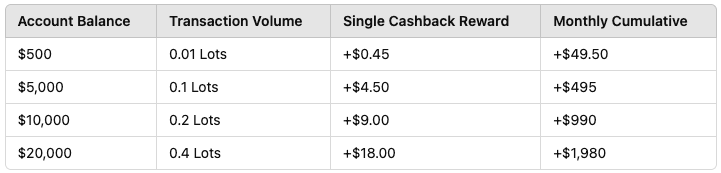The program features a straightforward structure that rewards account holders based on their trading activity. Traders can begin earning cashback with a minimum deposit of $500, unlocking rewards of up to $1,980 monthly.